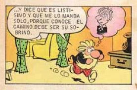 Dos ejemplos casi idénticos del mismo autor, Diego Irañeta, para las series Migui y El tape Juan, respectivamente, ambas publicadas en El clan de Mac Perro (1971). El dolor es representado por tres estrellas que salen en distintas direcciones de un gran chichón. En la persecución los personajes levantan nubes de polvo y su velocidad está indicada mediante líneas cinéticas.