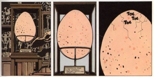 Un zoom en tres viñetas acerca lentamente al lector a un mistetioso huevo que se abre en estas viñetas de Jacques Tardi para Adèle et la Bête (Casterman, 1976).El tebeo se puede leer en Cloud 109.